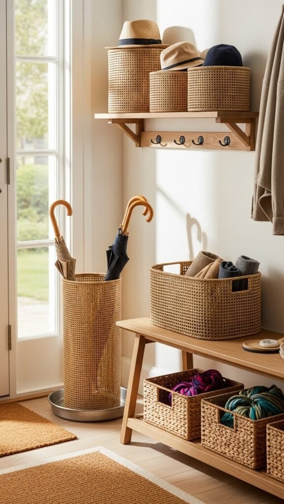 Add Woven Baskets for Umbrellas, Hats, and Scarves
