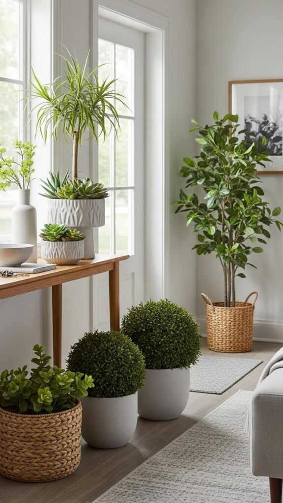 You’ll get instant warmth and personality without fuss. Mix heights, stick to a simple palette, and let green freedom set a welcoming, uncluttered tone for arrivals.