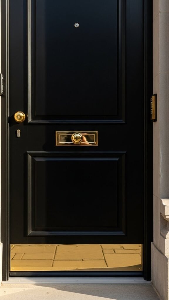 Bring a metallic or gold-framed accent next to a black door to introduce instant contrast and a luxe focal point—its reflective edge catches evening light and lifts the doorway without overwhelming it. You’ll hang reflective art that plays with shadow, add layered textures like woven mats or a matte planter, and keep styling minimal so the metallic gleams and your entry feels open and bold.