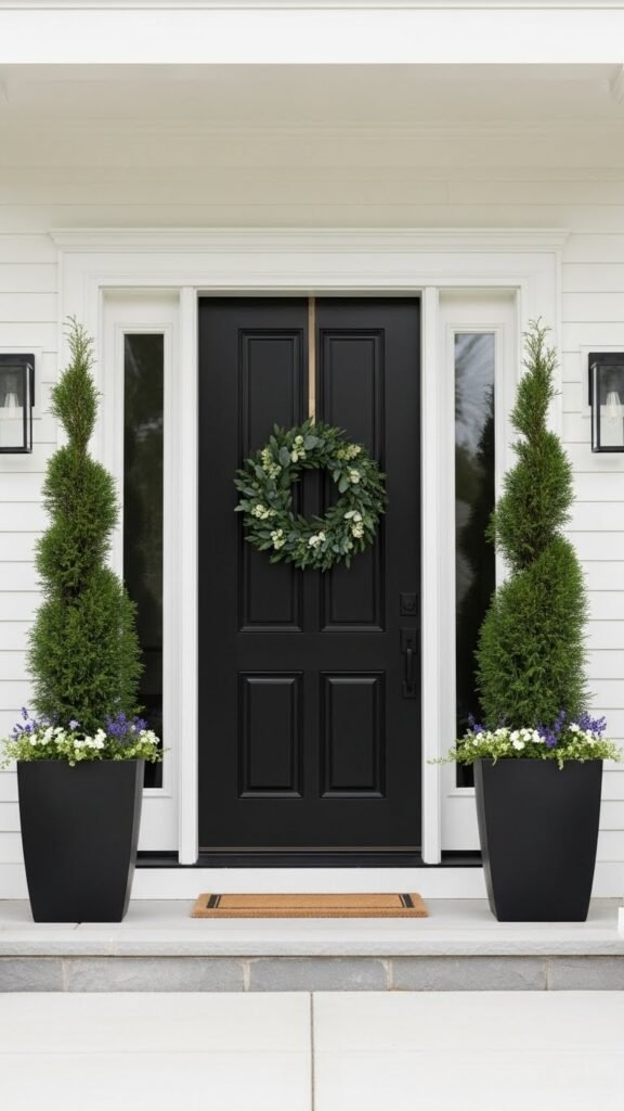 After your wreath sets the tone, frame the doorway with matching planters to amplify the look and add architectural rhythm. Place identical pots on either side to create matching symmetry; choose clean lines and bold finishes that feel modern and unconfined.