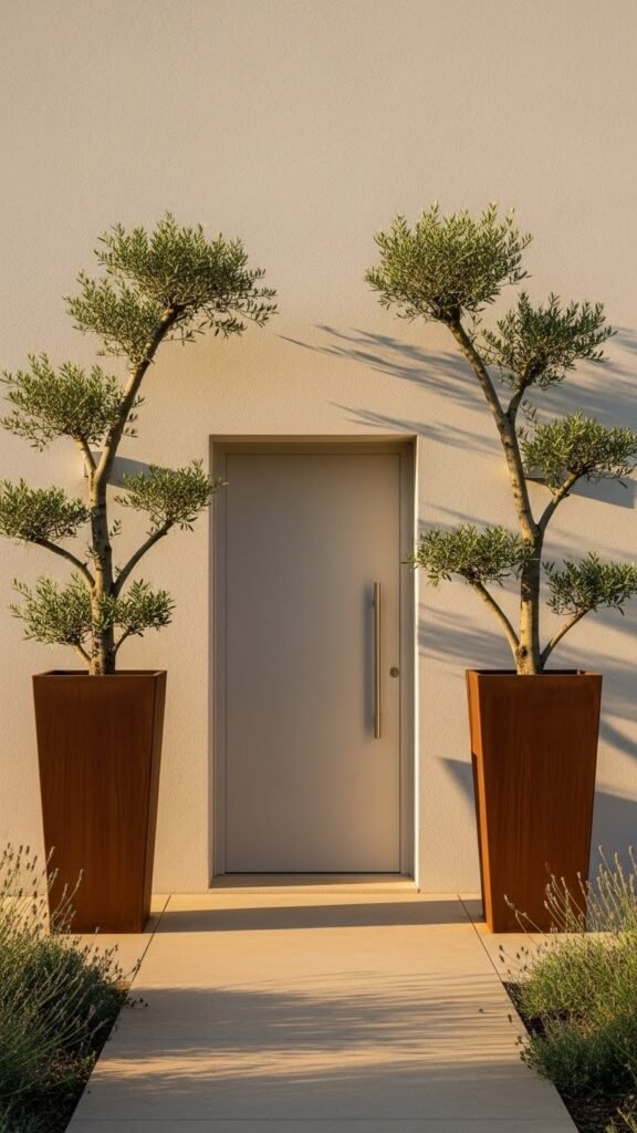 Swap your matching pots for sculptural steel planters and let slender olive trees introduce sculpted movement and Mediterranean warmth to the entry. You’ll favor minimalist silhouettes that frame the door without crowding it. Choose weathered steel planters for contrast, prune olives into an olive topiary for airy form, and keep placement simple — freedom to arrive and leave with effortless, modern elegance.