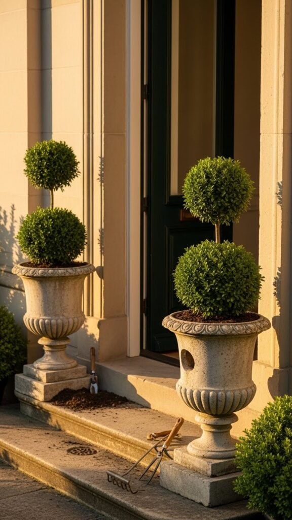 Frame your doorway with timeless symmetry: pair classic stone urns topped with neatly clipped boxwood topiaries to give the entry an immediate sense of formality and calm. You’ll enjoy crisp silhouettes that invite freedom and curb appeal. Prioritize boxwood maintenance—regular trimming and feeding—and make certain proper urn drainage to prevent root rot. Rotate positions seasonally to keep the display fresh.