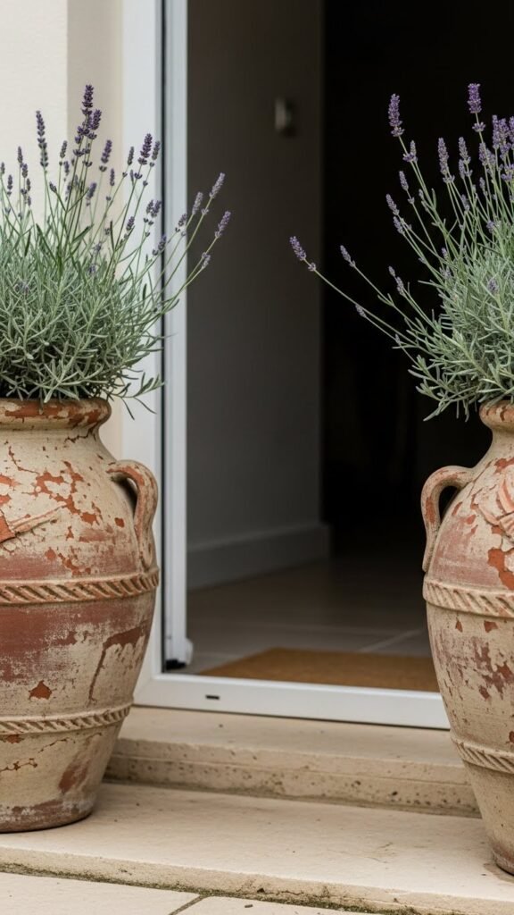 Bring a pair of distressed clay planters close to your doorstep and let lavender soften the entry with scent and texture; the weathered terracotta tones echo Mediterranean charm while the silvery-green foliage and purple blooms add fresh, contemporary contrast.