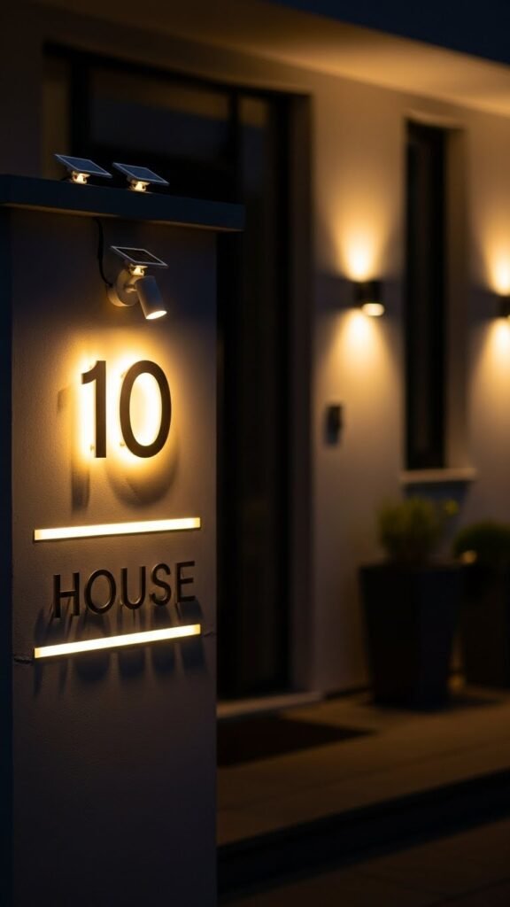 If you want your house numbers to read like a beacon after dusk, tuck slim LED spotlights beneath them and pair that glow with small gold accents to catch the eye. You’ll highlight reflective numerals for instant readability, while warm gilding accents add subtle luxe.