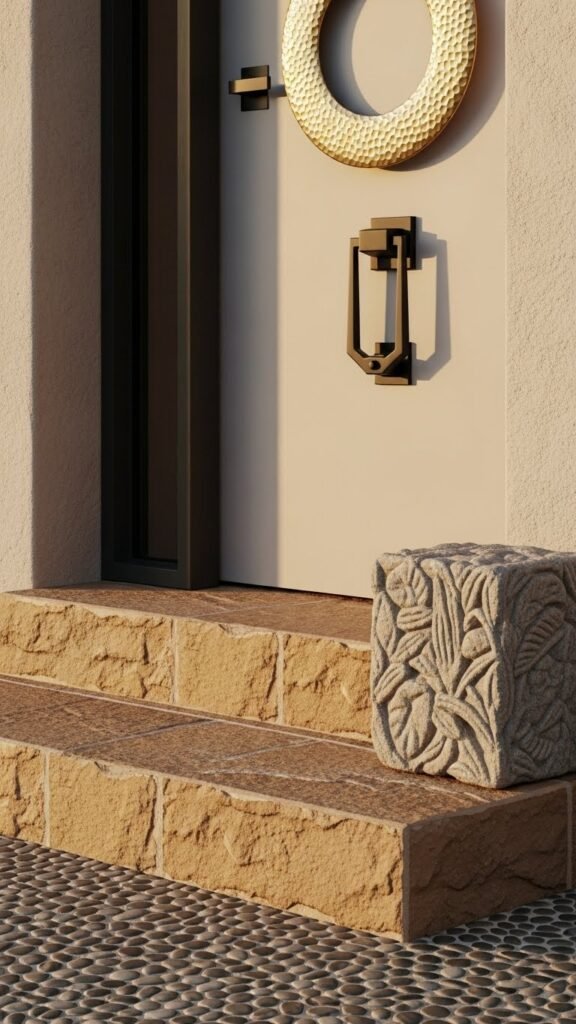 Pair that matte black knocker with warm stone steps to ground the entry—natural stone brings texture and an inviting weight that balances the knocker’s sleek geometry. You’ll layer textured limestone risers and a pebble mosaic landing, add a hand carved block for personality, then hang a hammered brass wreath accent. The result feels free, sculptural, and effortlessly modern.
