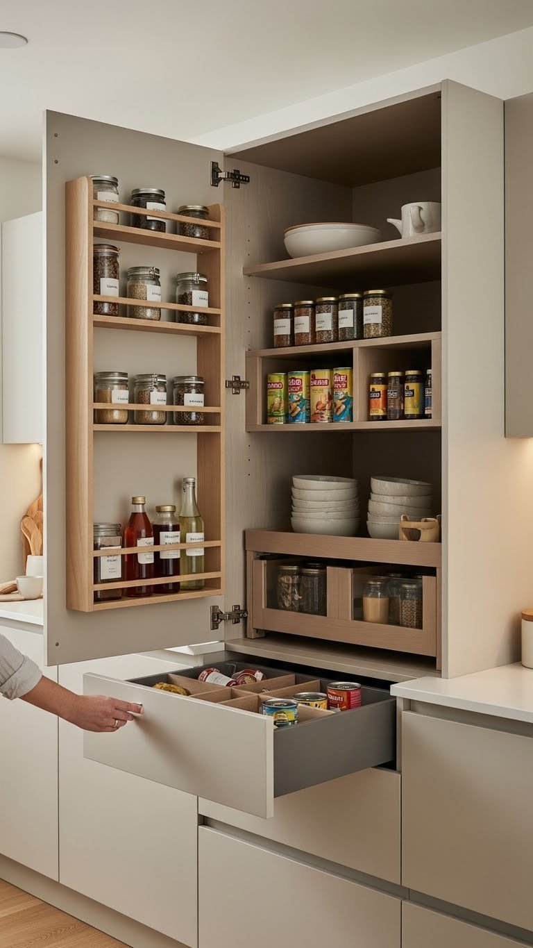 Tucked behind matching cabinet doors, a concealed pantry lets you keep a streamlined kitchen while giving everything its place; you’ll open a seamless front to reveal organized shelves, pull-out drawers, and clever compartments that make meal prep faster and cleanup effortless.