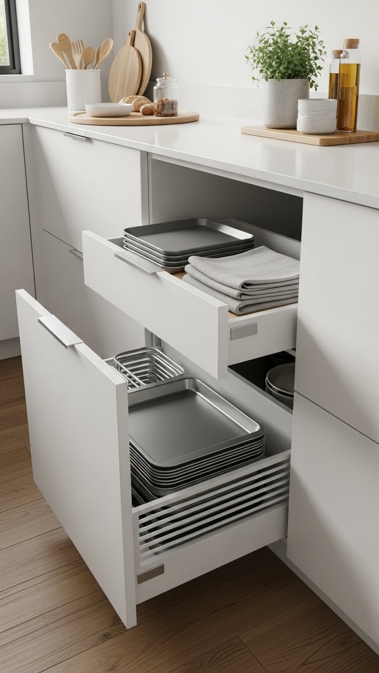You’ll gain a hidden toe kick for baking sheets, trays, or spare linens. Design them shallow, ventilated storage compartments so items stay fresh and accessible, freeing countertop and cupboard real estate without clutter.