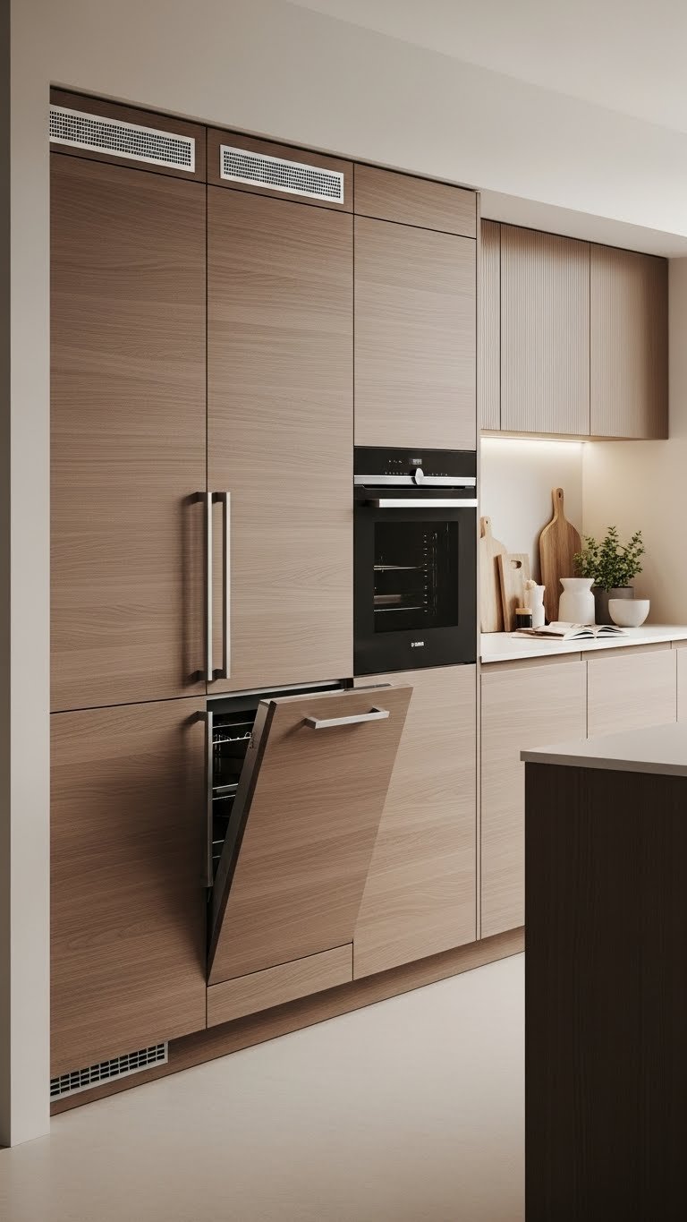 Tucked behind sleek doors and pull-out panels, a concealed appliance closet keeps your mixer, toaster and countertop gadgets ready yet out of sight, so your kitchen reads as calm and uncluttered.
