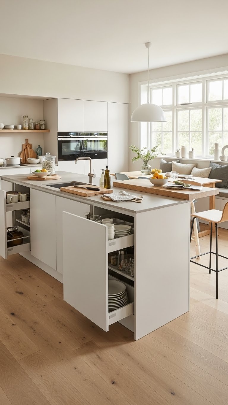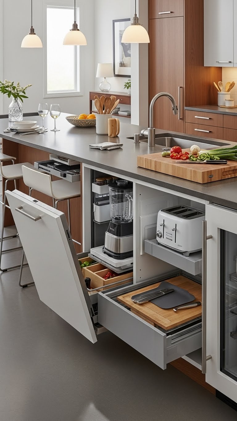 Think through how a multifunctional island can centralize cooking, cleanup, and entertaining without hogging the room. You’ll integrate a hidden dishwasher and compact appliance docking to keep surfaces clean and tools accessible.