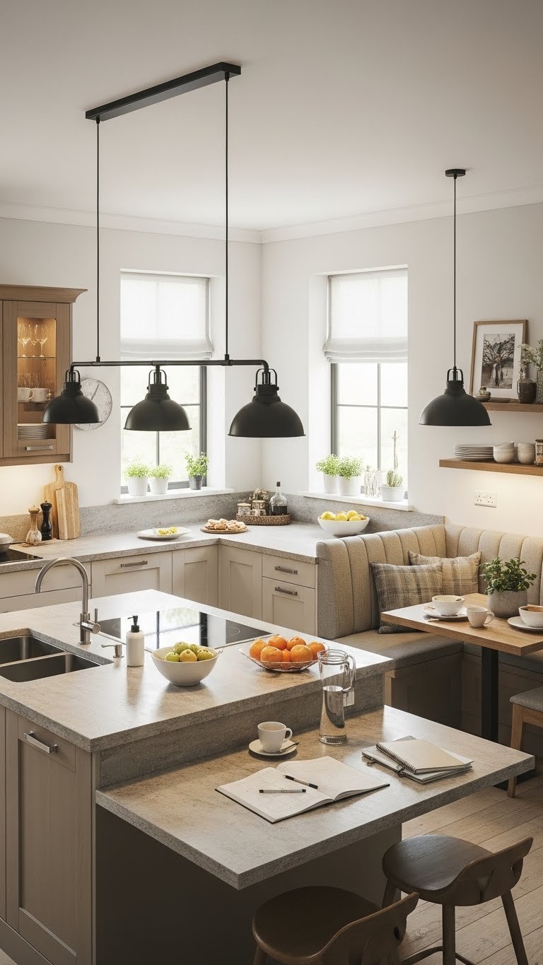 An L-shaped or U-shaped plan with a central island gives you the best of efficiency and social space: work zones hug the perimeter so food prep, cooking, and cleanup flow naturally, while the island becomes a hub for serving, casual dining, or homework. Position a corner banquette opposite the island to create cozy seating; prioritize lighting placement over ornament for flexible, liberated entertaining and focused tasks.