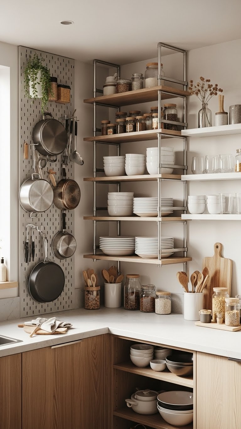 Run vertical shelving up your walls to reclaim every inch in a small kitchen: tall, narrow units and staggered open shelves keep countertops clear while giving you easy access to dishes, spices, and glassware. You’ll add vertical pegboards for tools and pots, mix slim floating shelves for display, and choose adjustable brackets so you can rearrange freely, maximizing storage without crowding your space.