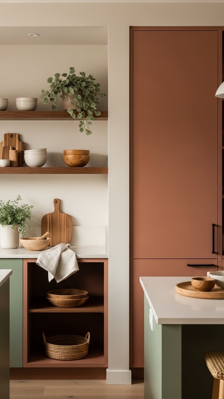 A muted palette of warm browns and soft greens will ground your kitchen while keeping it inviting and modern; pick one dominant earth tone—like a clay cabinet or a sage-painted wall—and layer complementary shades for depth.