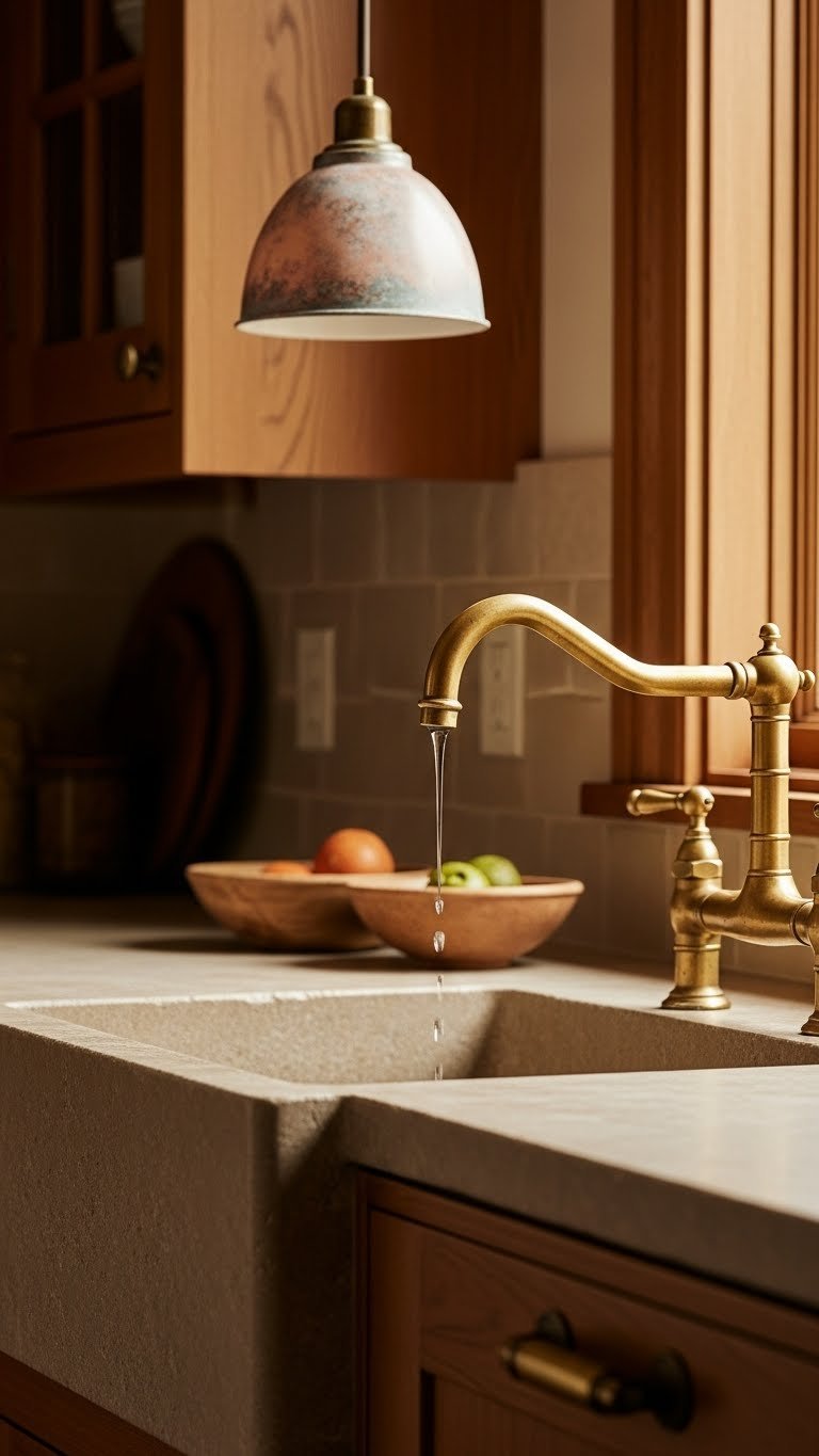 When you choose unlacquered brass or bronze for faucets, pulls, and light fittings, the metal softens a kitchen’s edges with warm patina that evolves over time. You’ll enjoy fixtures that age gracefully; unlacquered brass warms wood and stone while aged bronze grounds bright palettes. Install durable hardware, keep cleaning minimal, and let the finish develop character that reflects your independent, lived-in style.