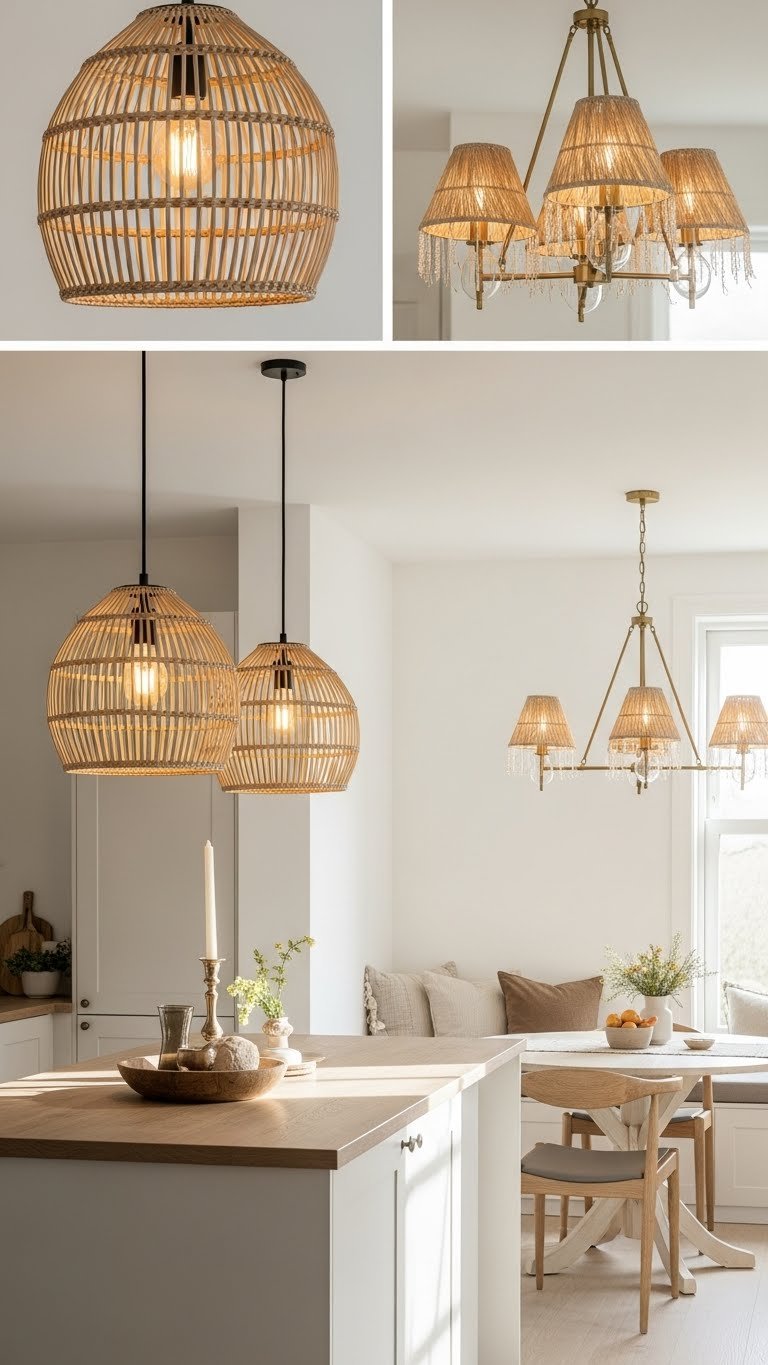 Let woven and mixed-material lighting bring texture and warmth into your kitchen: rattan, seagrass, and handwoven fibers pair with metal or glass to create fixtures that feel crafted rather than catalog-bought. You’ll choose Woven pendants for islands and Mixed material chandeliers over dining nooks, balancing scale, light diffusion, and finish. They add freedom-infused charm while staying practical and effortlessly durable.