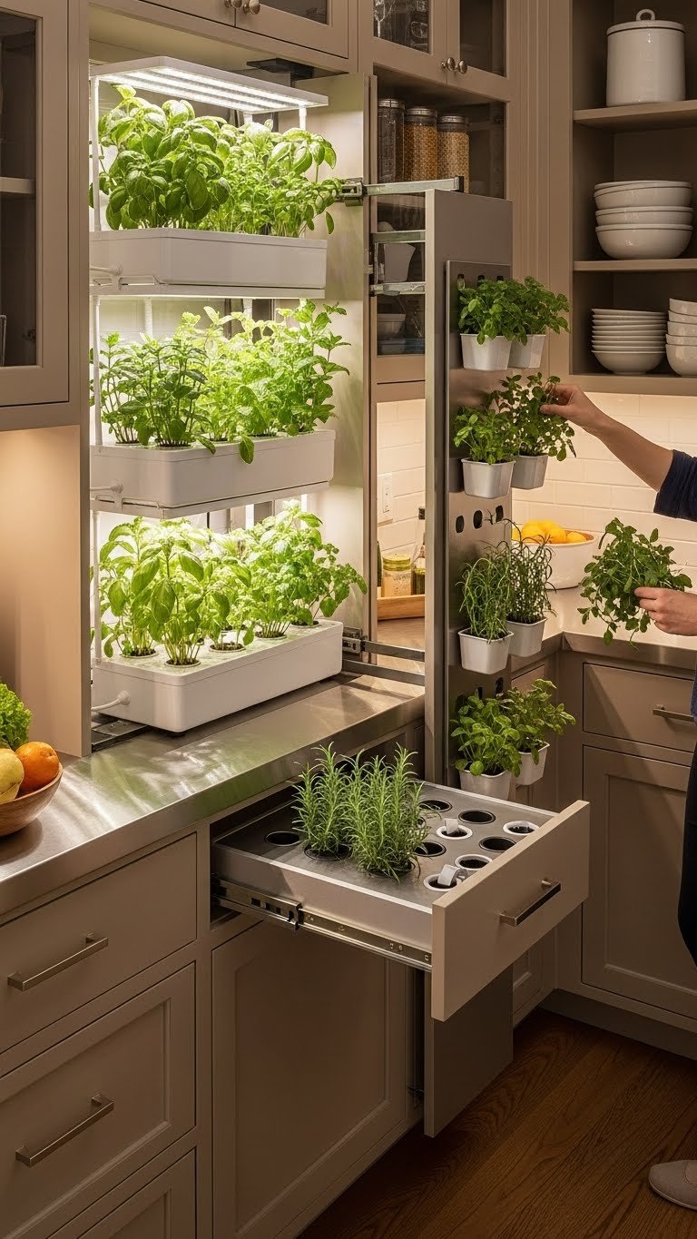 You’ll love vertical hydroponics racks or slim drawers with magnetic planters that snap to metal panels. They save counter space, deliver peak herbs on demand, and let you cook freely—efficient, tidy, and undeniably stylish.