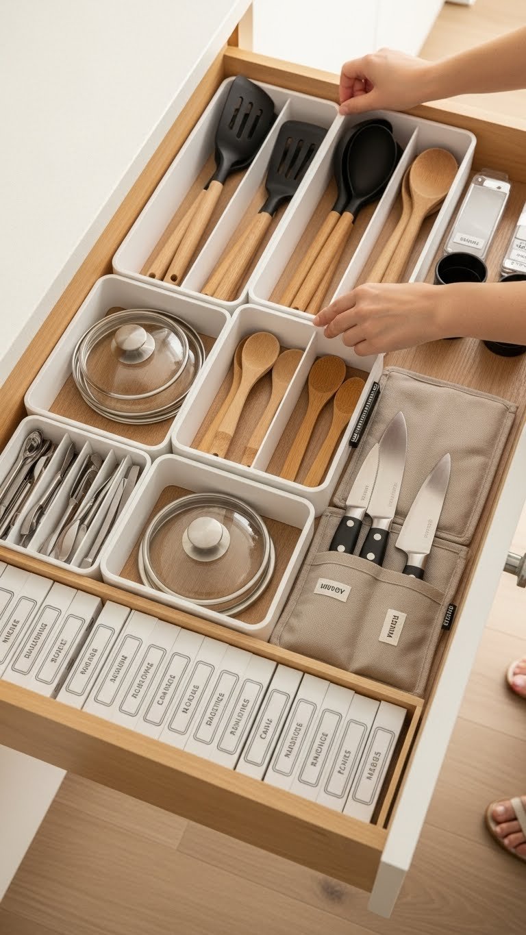 Tidy up drawers by fitting them with purpose-built dividers and inserts that make every utensil, gadget, and lid easy to find.