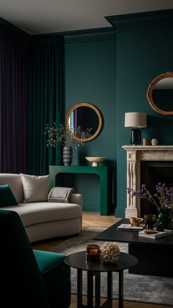 When you paint a wall in emerald, sapphire, or amethyst, the room instantly gains depth and drama without feeling heavy—these jewel tones anchor the space and make colors pop. You’ll pair velvet drapery with sculptural furniture, balance matte textures, and use emerald accenting sparingly—think a single console or linen—to create a liberated, chic living room that feels curated and boldly free.