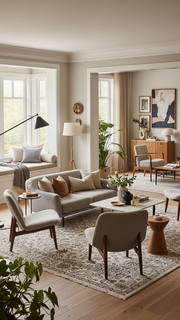 Create conversation alcoves with compact sofas, sculptural chairs, and layered rugs; tuck window benches for morning reading and solo lounging.