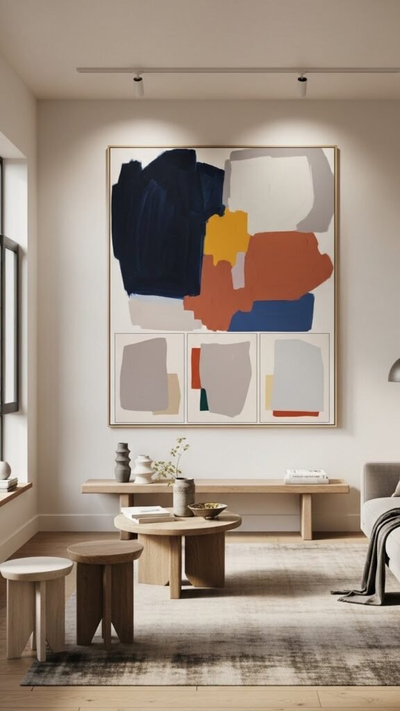 If you want the room to read as confidently edited, curate a single large-scale artwork to anchor the space and set the tone—bold brushwork or a quietly graphic piece can establish your color story, scale, and mood in an instant.