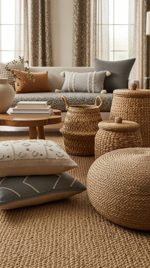 You’ll layer woven baskets for sculptural storage, jute poufs as casual seating, and sisal rugs for grit.