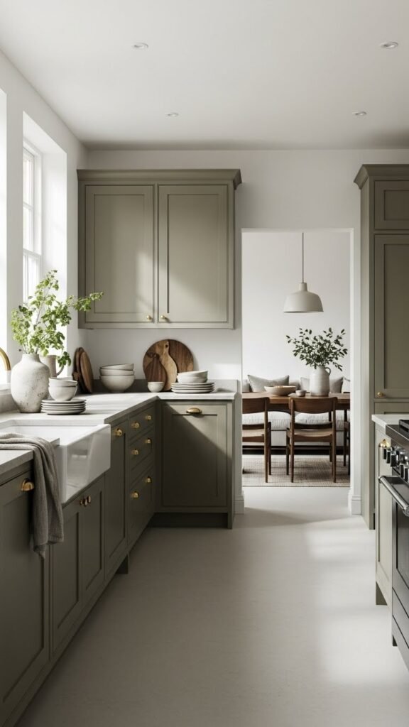 Choose muted olive or charcoal taupe cabinets to anchor your layout, pair with warm brass hardware and open sightlines, and let liberated, intentional contrast define a modern, lived-in sanctuary.