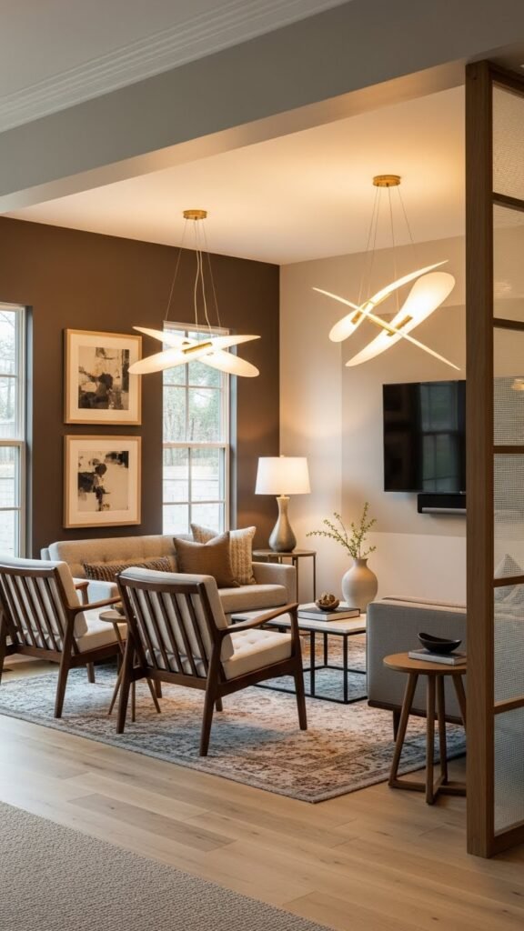 Establish a formal alcove with paired chairs, a low-profile sofa, sculptural lighting, and a rug to anchor conversation zoning. Use slim room dividers, contrasting paint, and art to define the space, encouraging unrushed dialogue and liberated social ritual.