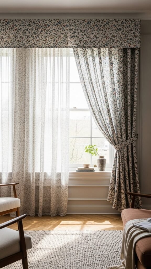 Frame your windows with patterned curtains and sheers to give the room instant personality and layered depth. Choose printed sheers for soft privacy and light play, then pair with bold panels hung high to widen the view. Use tied back panels to reveal architectural details or let them drape for drama. You’ll create a liberated, curated vibe that feels intentional and free.
