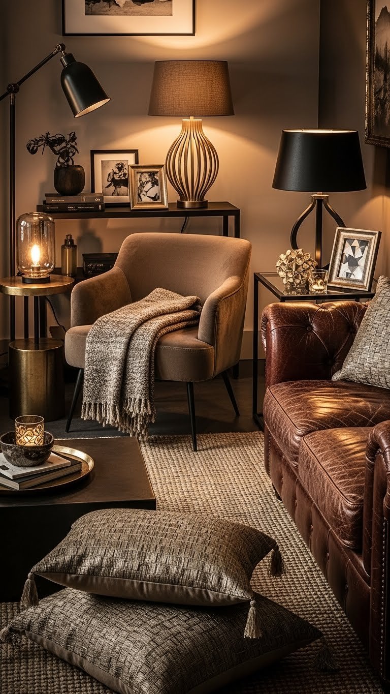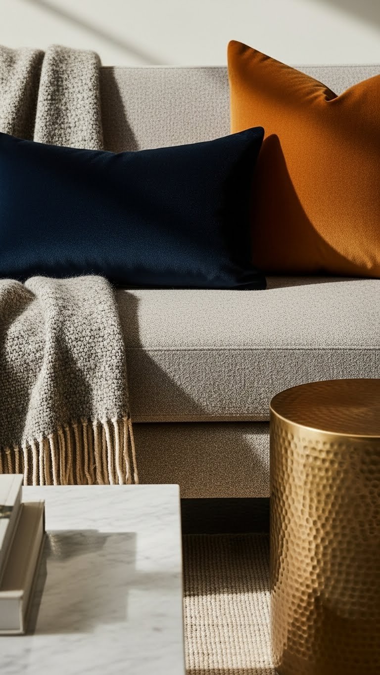 Embrace tactile layering: mix bold velvet cushions, a nubby throw and matte metal accents so surfaces sing together.
