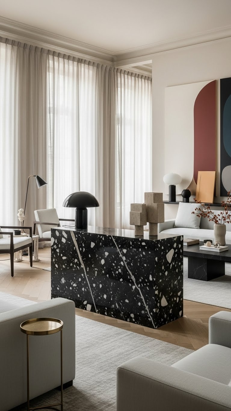 Introduce dark marble as your room’s grounding element to give a luxe, sculptural anchor that balances lighter textures and metallic accents. Choose a dramatic onyx console or veined terrazzo slab to create contrast and visual weight.