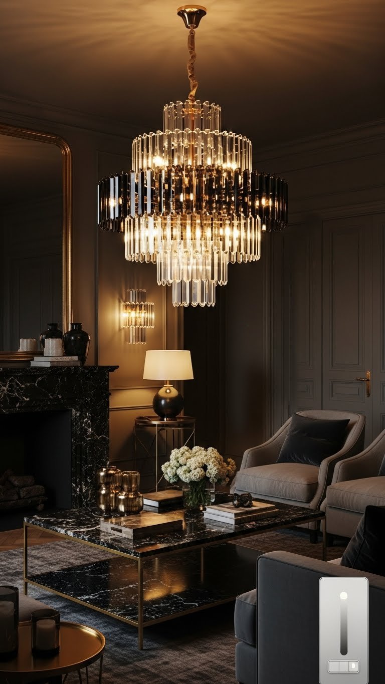 Although a chandelier can be dramatic, choose one that casts a warm, layered glow to anchor the room without overpowering it; think sculptural forms in aged brass or smoked glass that echo your antique-gold accents and dark marble elements.