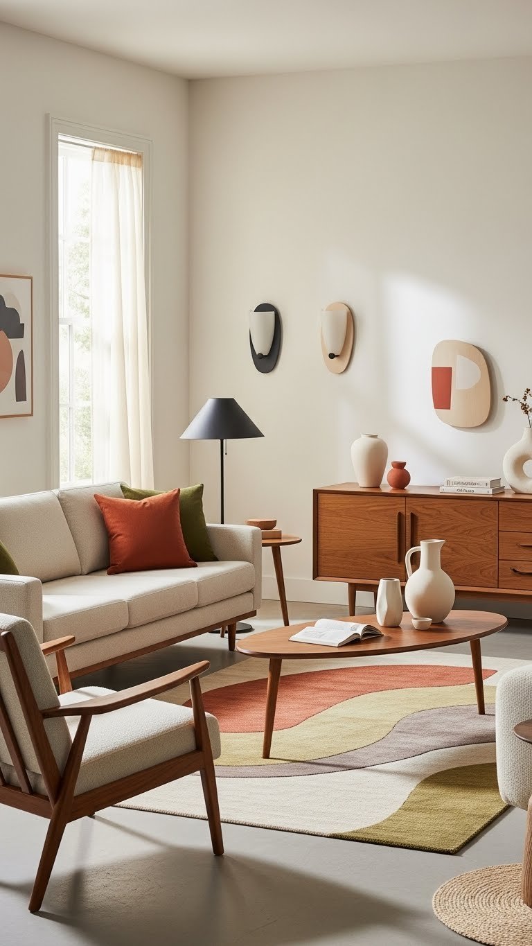 If you want a living room that feels simultaneously timeless and fresh, marry mid-century silhouettes—clean, tapered legs, sculpted wooden frames, and planar profiles—with organic shapes like rounded coffee tables, biomorphic sconces, and sinuous textiles.