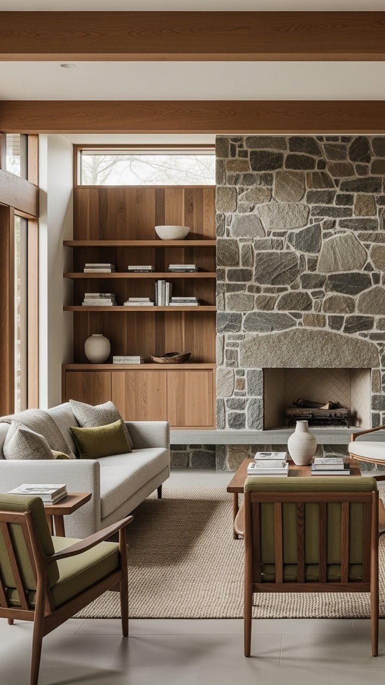 Pair mid-century structure with raw, tactile finishes by bringing natural wood and native stone into the room; they’ll anchor the refined silhouettes with material warmth and geological character.