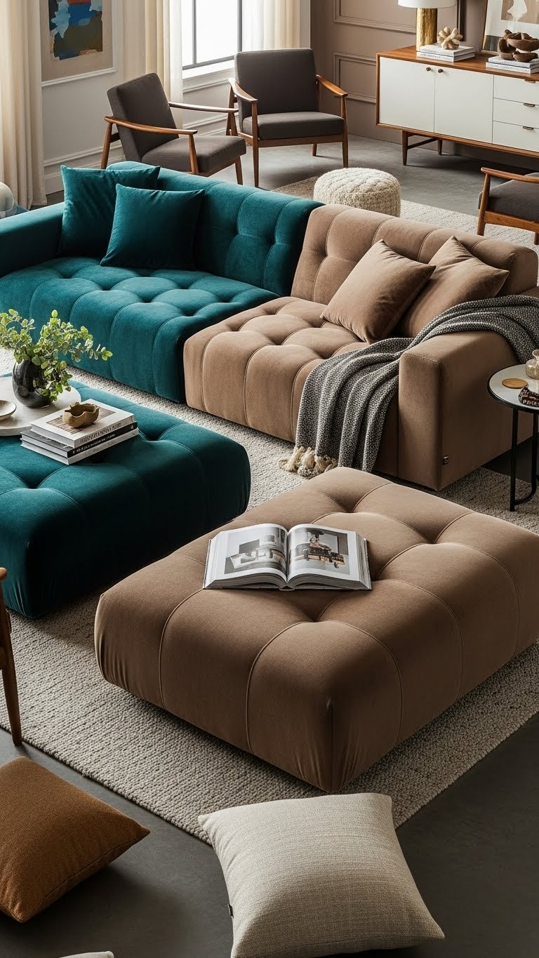 You’ll mix a modular lounger for adaptability, balanced by stacked ottomans for sculptural storage and extra seating, keeping the room airy, confident, and easy to rearrange.