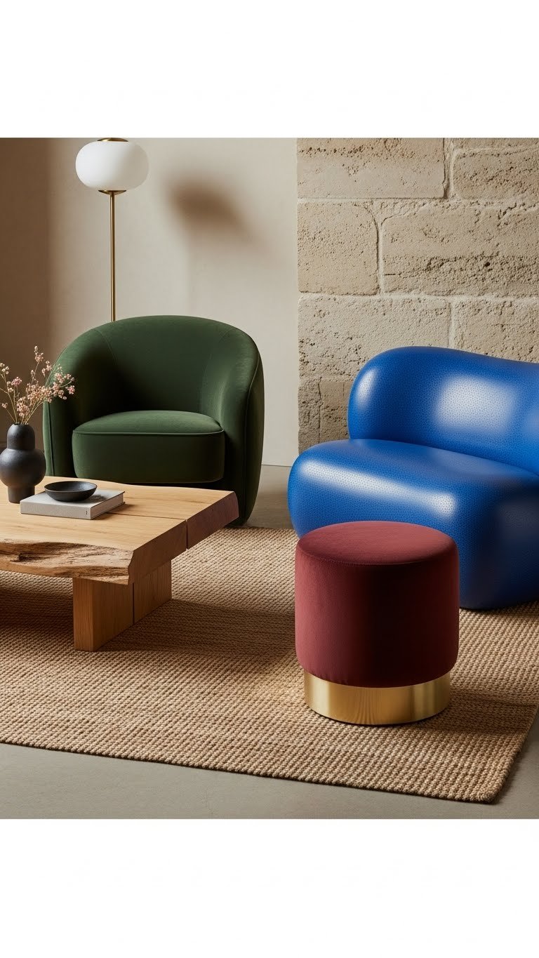 After layering your earthy palette, introduce sculptural curved seating to soften the room’s geometry and amplify that curated, luxurious vibe. Opt for rounded ottomans and sculptural banquettes in supple linen or velvet to invite lounging and conversation. Curves create effortless flow, free movement and a relaxed sophistication—pair with minimal accents, warm metals and thoughtful scale to keep the look intentional and liberated.
