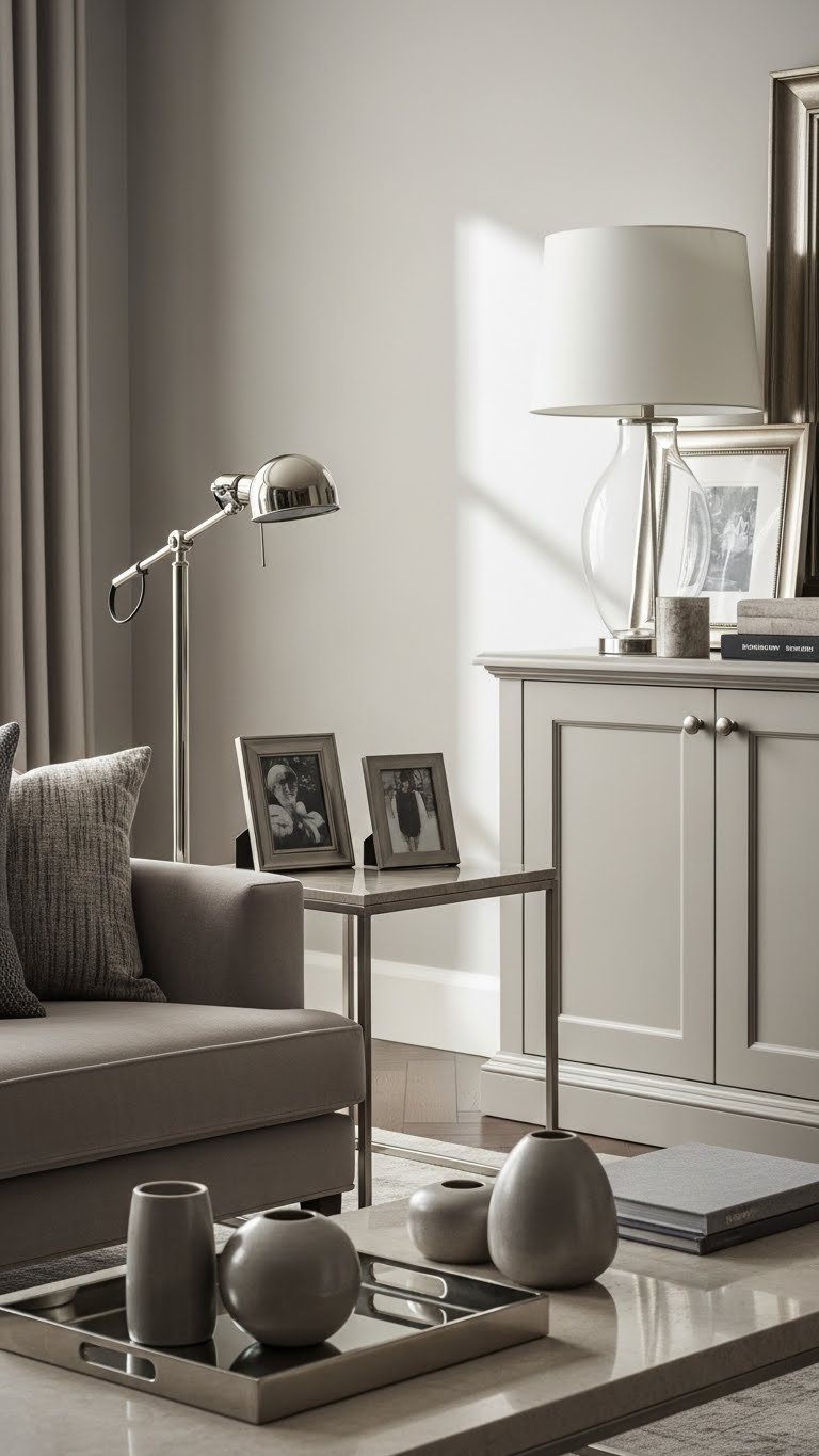 Introduce mixed metals to add quiet complexity and dimension to your luxe living room. You’ll balance polished nickel fixtures with matte pewter accents—think lamps, frames, and hardware—to create layered contrast without clutter.
