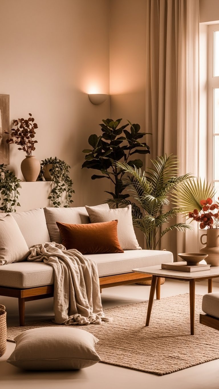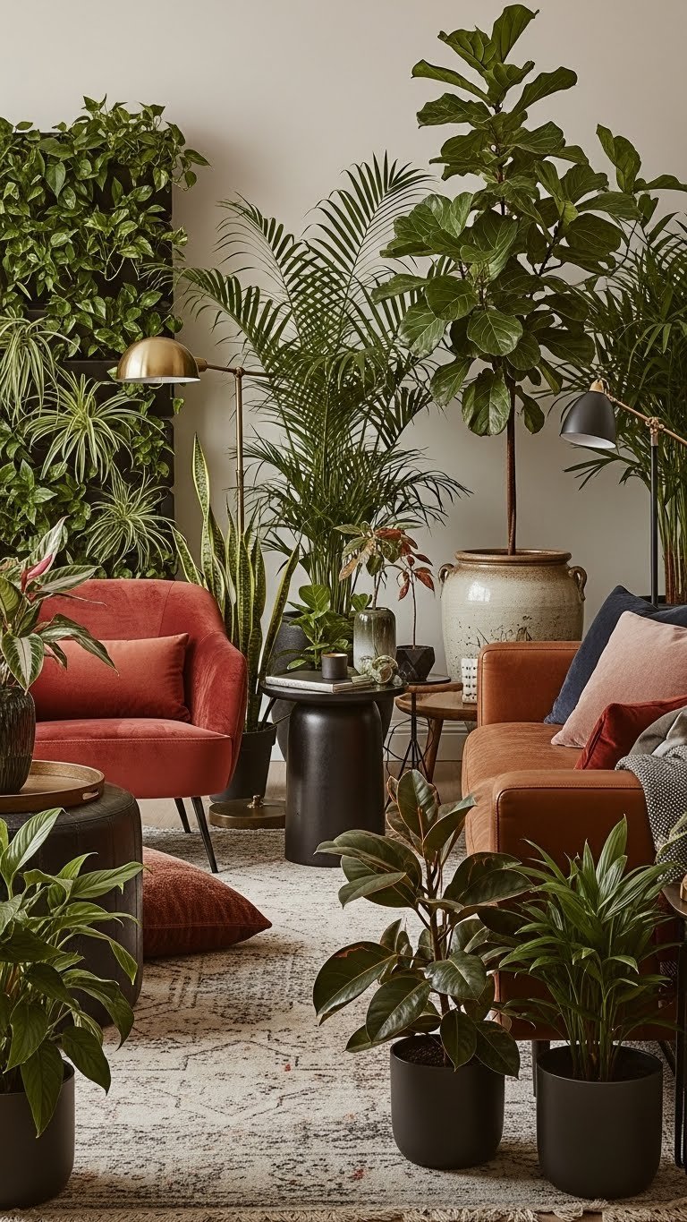 Bringing lush greenery into your seating area works best when it sits on a calm, warm neutral base—think soft taupe walls, creamy plaster, and sand-hued textiles that let oxblood and mocha moments sing without competing.