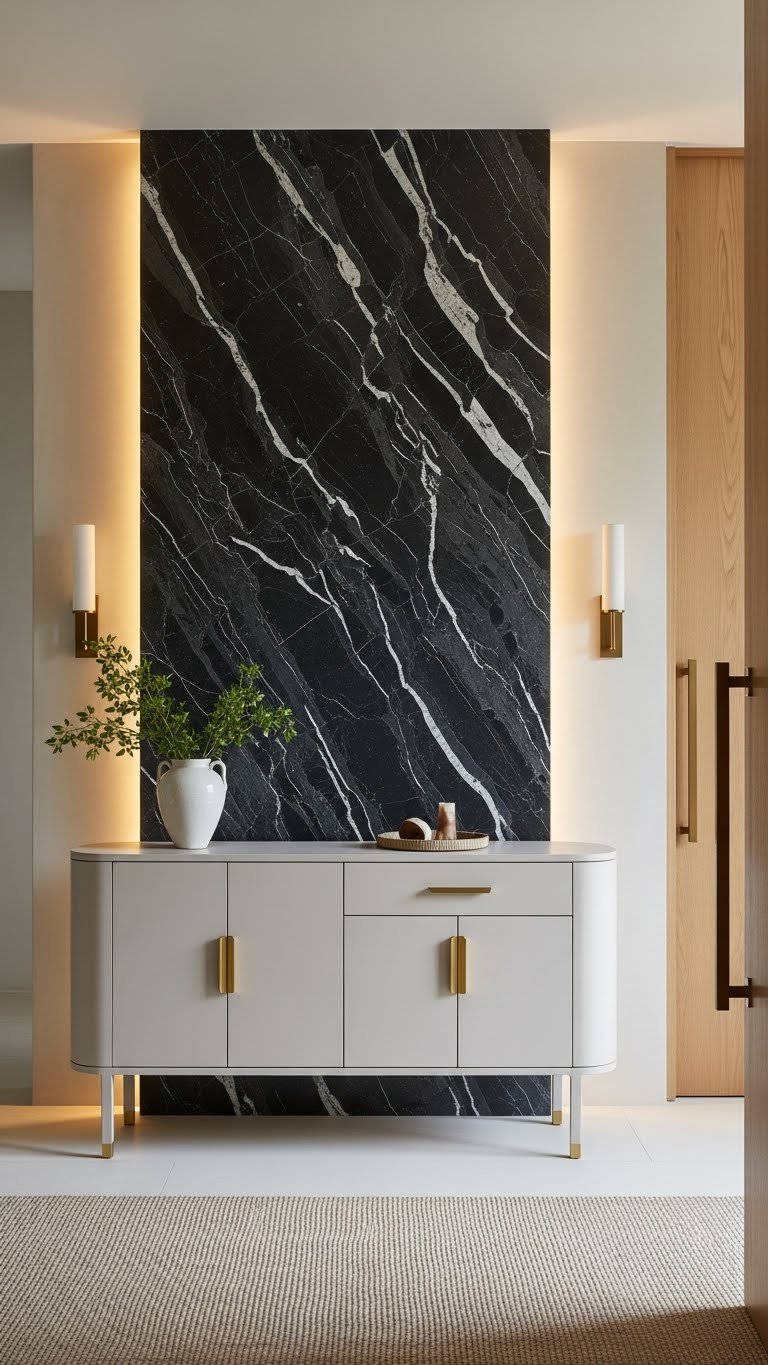 Although dramatic at first glance, dark-veined surfaces can read surprisingly refined when balanced with lighter textures and streamlined silhouettes. You’ll layer veined wallpaper behind a sculptural console, introduce matte inlays on cabinetry, and choose minimal brass accents to keep things airy.