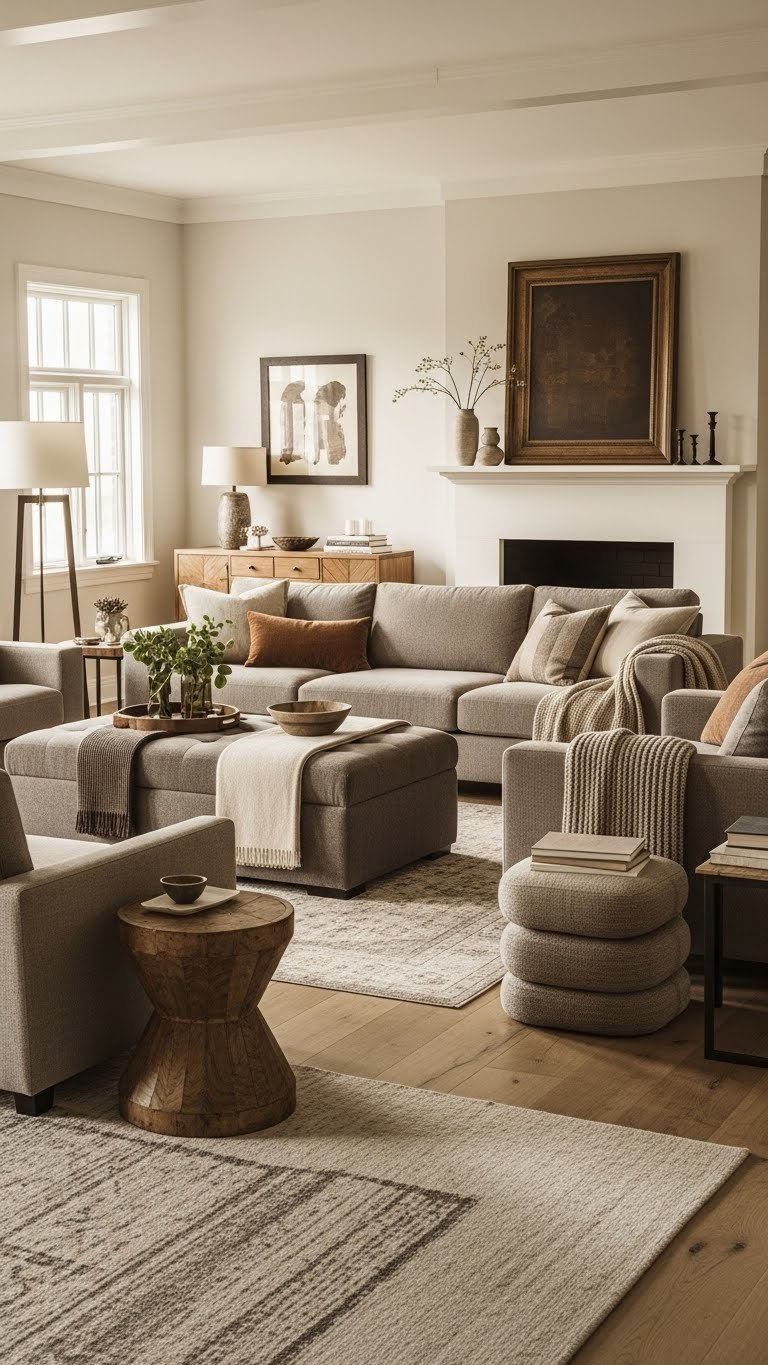You’ll choose warm taupe and soft greige as a restrained canvas, layer texture, and keep lines clean so the room breathes, feels luxurious, and invites effortless movement.