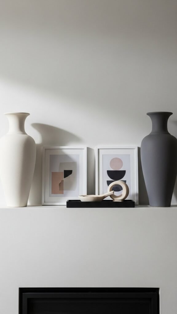 Start by anchoring the ends of your mantel with a matched set of vases—same height, same finish—to create an instant sense of balance and calm. You’ll pair matched urns or sculptural mirrored vases, leaving negative space between. Keep accessories low and graphic so the symmetry breathes; it feels curated, modern, and liberating—your mantel becomes a calm statement of deliberate, uncluttered style.