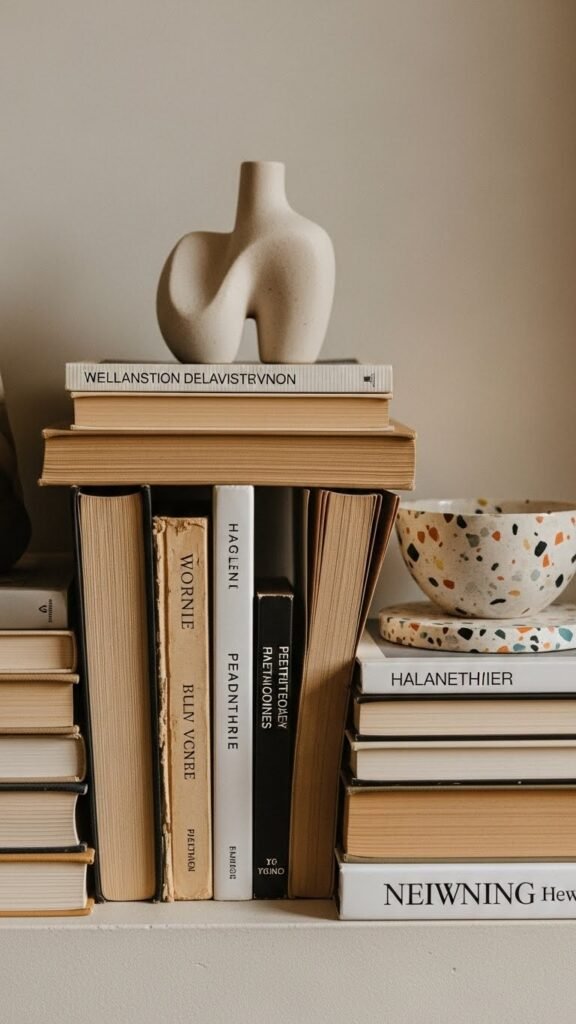 You’ll mix antique paperbacks with modern covers, tuck a terrazzo coaster beneath a ceramic piece, and angle spines for texture.