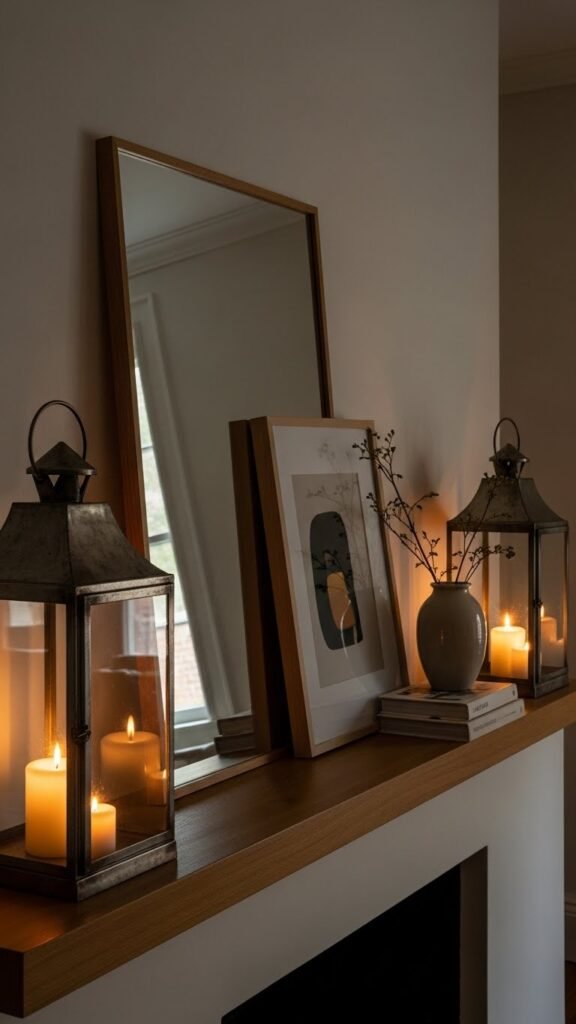 Move from that intimate, book-led vignette into softer, glowing accents by placing a pair of lanterns at either end of the mantel—they anchor the composition while echoing the curated, gallery-ready feel. You’ll love how the flickering candles cast a cozy glow, balancing clean lines with vintage charm. Let them frame art or mirrors, giving your space freedom, warmth, and subtle, lived-in elegance.