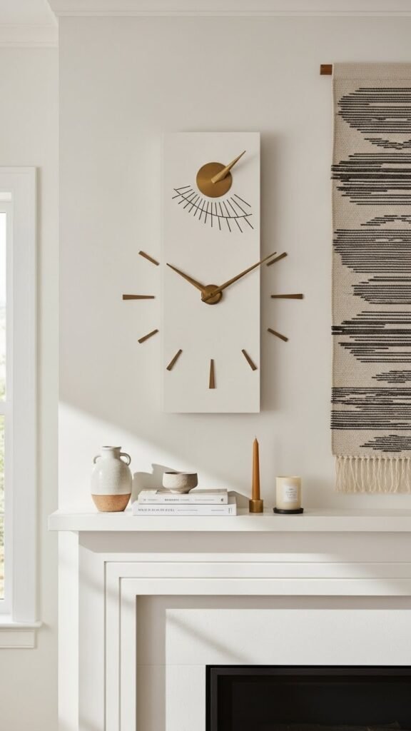 Let an oversized sundial-inspired face echo sculptural minimalism, or pair the clock with a vertical tapestry to stretch the eye upward. You’ll command the room’s rhythm, embrace airy freedom, and keep the vignette chic, balanced, and effortlessly Pinterest-ready.