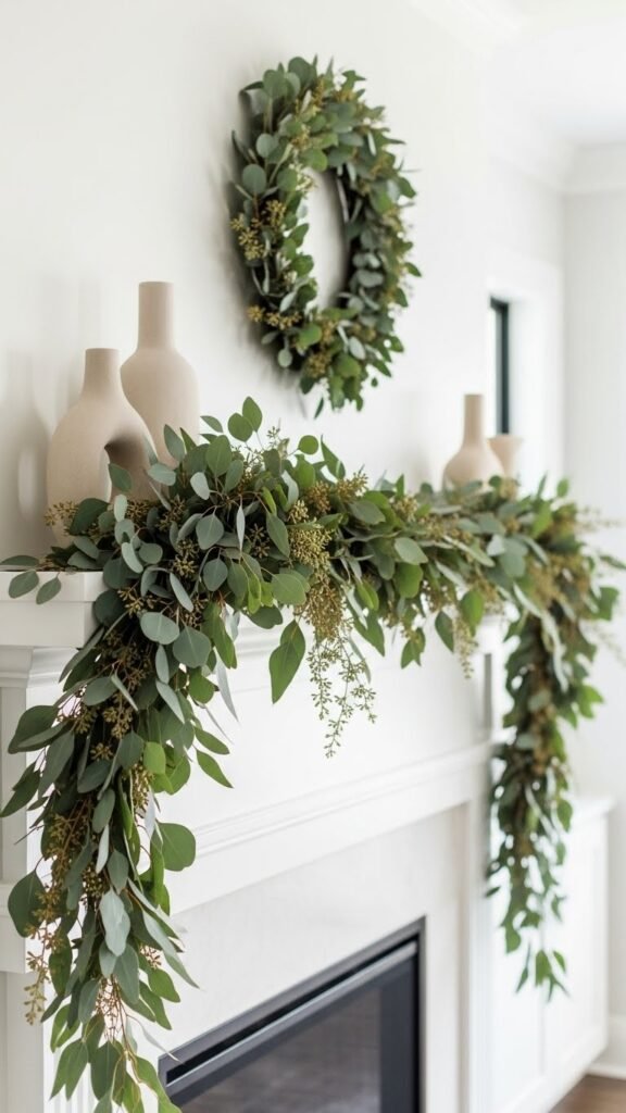 Often you’ll drape a fresh eucalyptus garland along the mantel to add instant texture, scent, and a relaxed layered look that still reads modern.