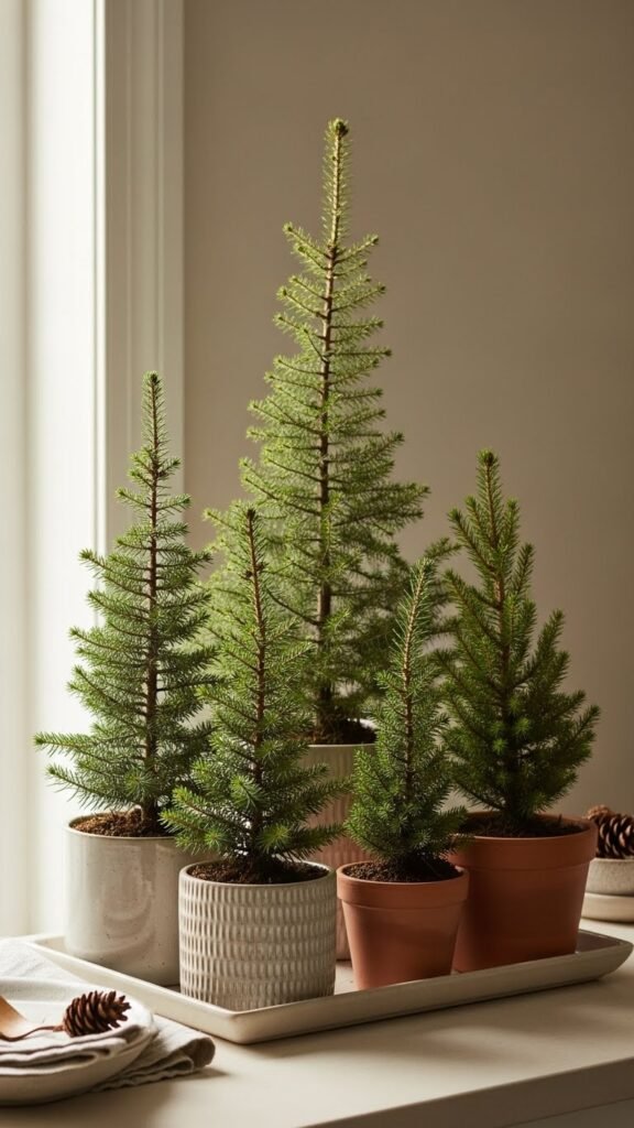 You’ll mix mini spruce and textured pots, anchoring with a low tray so they read as one curated group. Lean into asymmetry, negative space, and easy swaps to keep the look fresh and free.