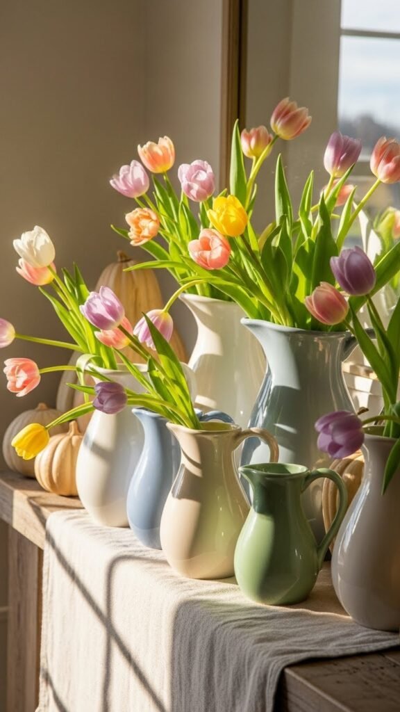 After the calm of neutral gourds, swap in the bright, effortless optimism of tulips arranged in sculpted ceramic pitchers to refresh your mantel for spring. You’ll choose a vintage pitcher or several with ceramic sheen, cluster pastel tulips loosely, and lean into casual farmhouse charm.