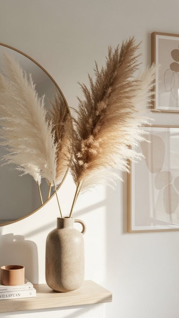 Often, a single oversized arrangement of dried pampas grass becomes the effortless centerpiece that instantly elevates your mantel — its feathery plumes add sculptural height and a soft, tactile silhouette against art or mirror.