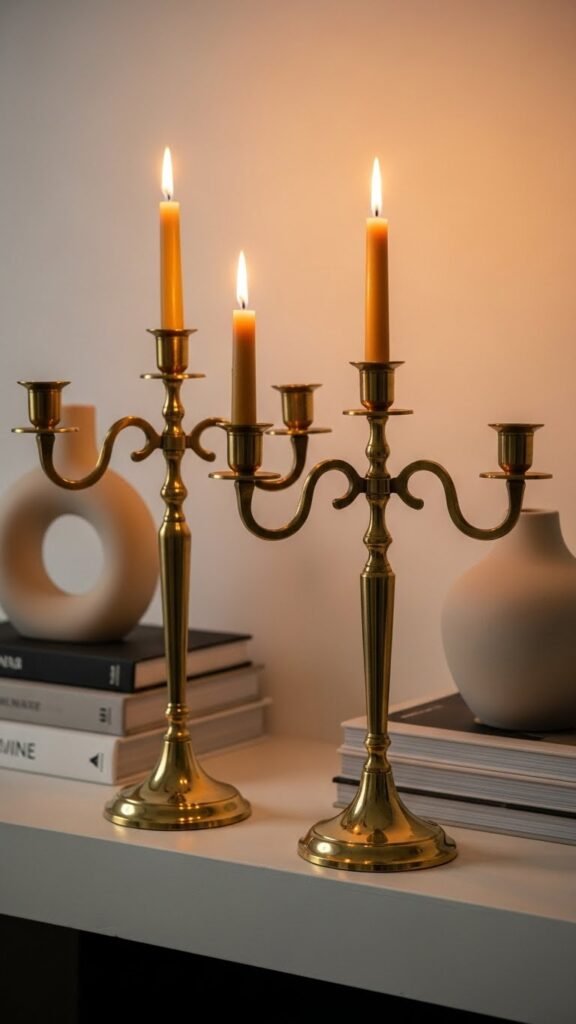 You’ll pair them with minimalist books or a sculptural vase, letting antique polish and ambient shimmer speak. Position asymmetrically for effortless flair, light real or beeswax candles, and let the glow feel liberating, not contrived.