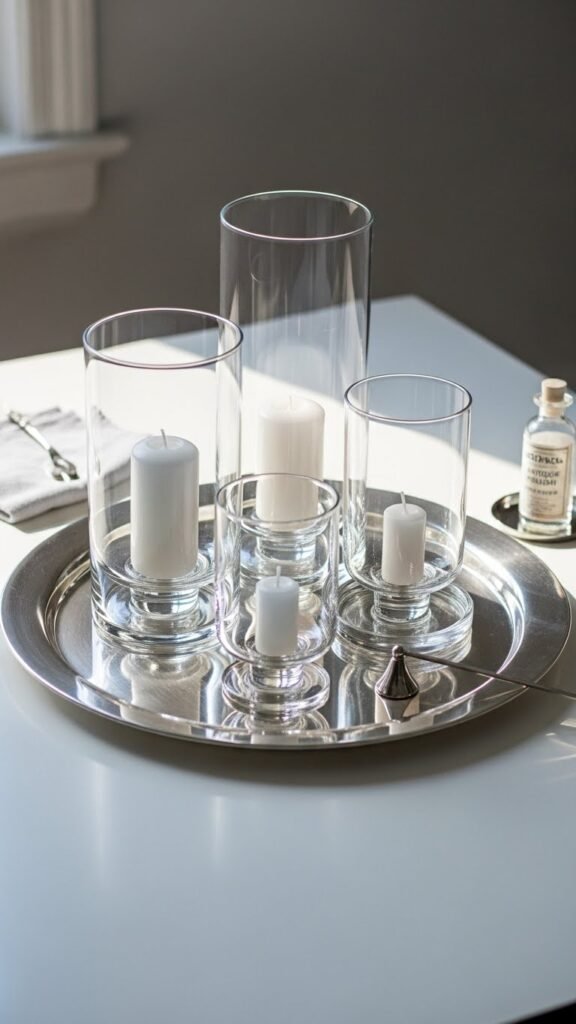 You’ll layer varying heights, mirror light, and let clear glass feel airy. Use antique polish sparingly for patina, arrange candles with candle safety in mind, and keep the look minimal, breezy, and confidently curated.