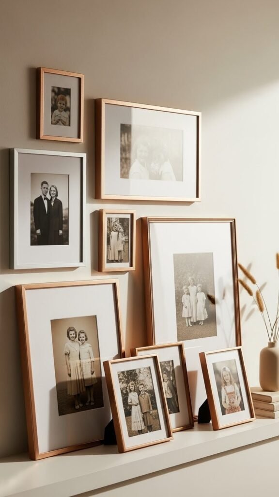 Anchor your mantel with a rose gold frame family collection that feels modern, warm, and effortlessly curated. You’ll mix sleek lines and vintage rosegold finishes to let heirloom portraits breathe alongside candid prints. Arrange varied sizes, lean a few against the wall, and leave negative space. The result feels free, personal, and intentionally edited—an escape from stuffy, overdecorated mantels.