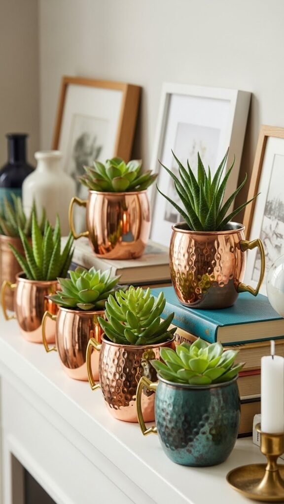 Tucked among books and frames, copper mugs with faux succulents bring a warm, metallic edge and low-maintenance greenery to your mantel—mix shiny, hammered, and patinated finishes to echo the room’s tones and vary heights for visual rhythm.